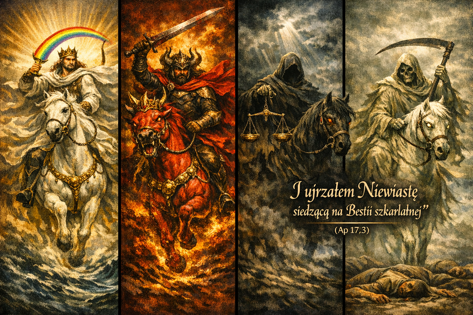 Jeszcze wcześniej pojawia się czerwony koń – Szatan. To on zabiera pokój z ziemi. Jego mieczem są potępieńcy, którzy zabijają resztę potomstwa Niewiasty – Maryi. To archetyp Kaina i Abla, bratobójstwo wpisane w dzieje ludzkości. To wojna, która nie jest tylko konfliktem narodów, ale duchowym starciem między potomstwem Niewiasty a potomstwem węża.